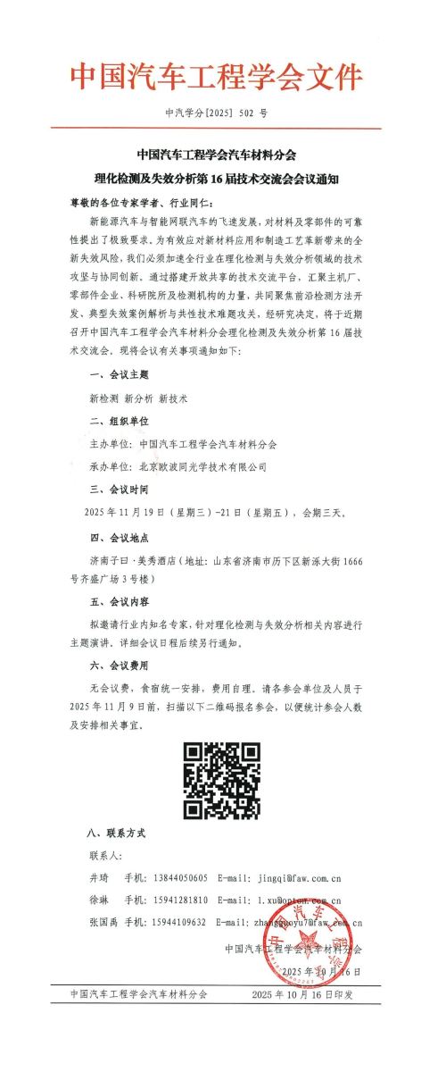 活动发布|中国汽车工程学会汽车材料分会理化检测及失效分析第16届技术交流会会议通知