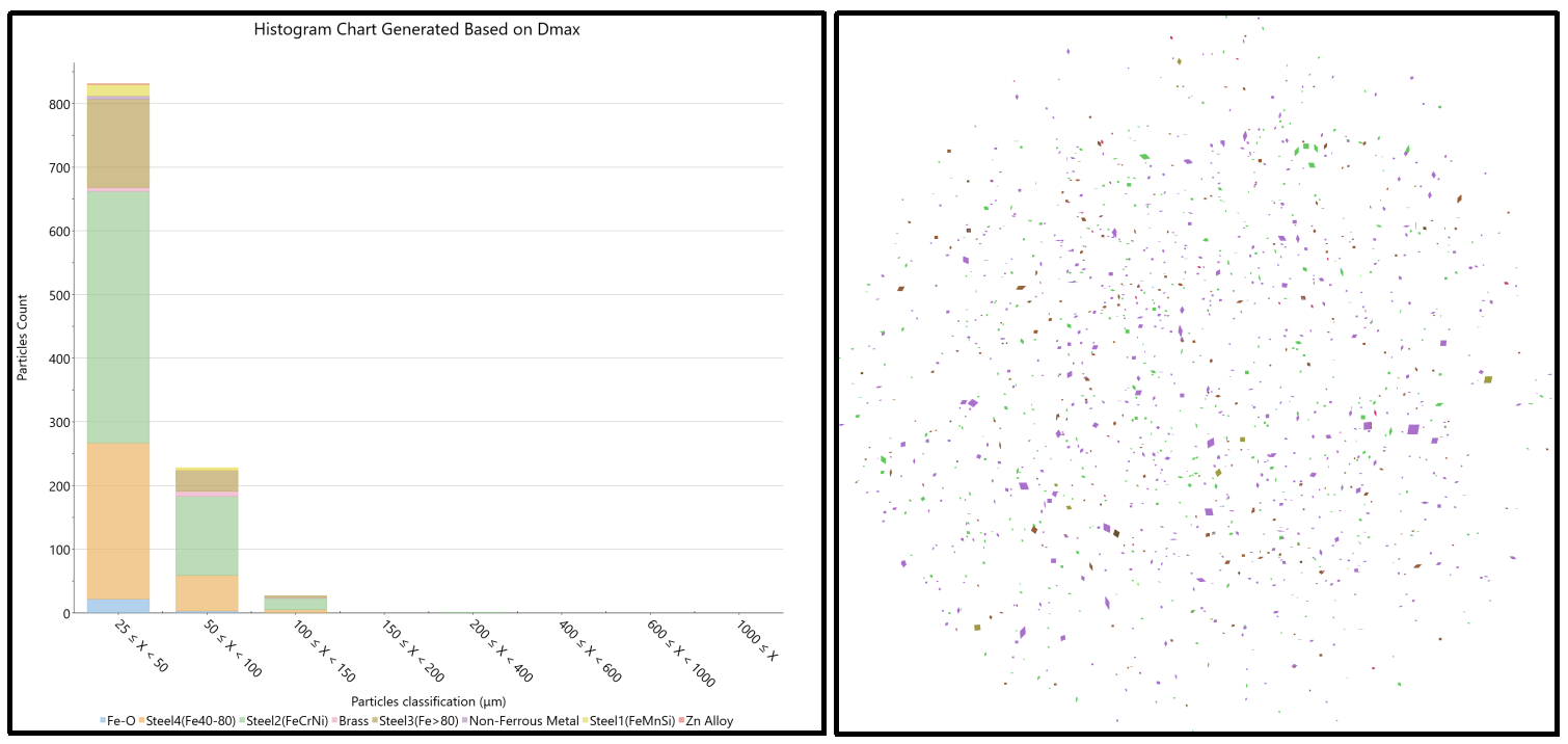 图7 颗粒尺寸、成分分类直方图(左)和所有颗粒分布图(右)