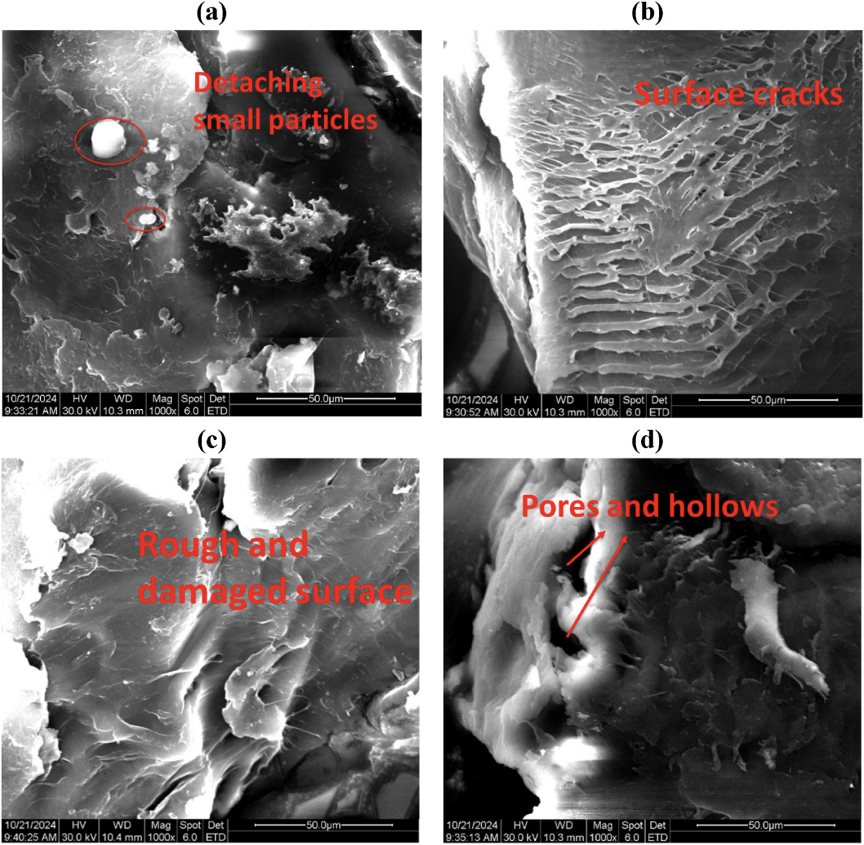在SEM图中,观察到细小的塑料颗粒从裂缝以及损坏和粗糙的表面中脱落,为微颗粒和纳米颗粒在废水处理过程中的形成和释放提供了证据。这些裂缝是由机械断裂引起的,这种过程原子键或分子键的分离增加了材料的脆性,促进了进一步分解成更小的颗粒,包括NPs。在这种情况下,驱动MP碎片形成的主要机制是机械诱导的水剪力,这些力在各种污水处理过程中有效,如筛选、去除砂、沉积、混合、泵送和起泡。