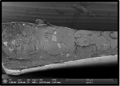 如下图所示,在500V低电压下,直接将截面的PE塑料置于Apreo 2电镜中,不会产生任何荷电和损伤,同时只需移动几次鼠标,就可完成必要的合轴对中、消像散和图像聚焦校正,即使电镜初学者也能充分发挥Apreo 2的ZUI佳性能。通过电镜结果,可以轻松观察10W倍下PE截面颗粒大小及其分布。