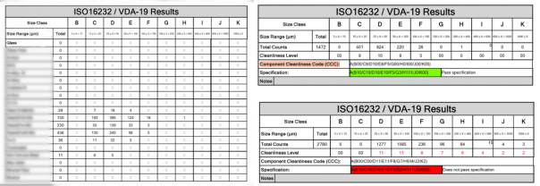 在ISO 16232中规定了按照颗粒尺寸大小将不同的颗粒进行分类输出报告,同时可以根据尺寸分类等级对其进行零部件清洁度代码(CCC)判断。Aixa-Perception系统完全符合标准要求,自动进行颗粒尺寸等级分类,同时自动进行CCC代码判断,输出结果合格或失败。