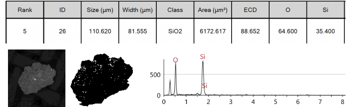 在成分分类上,光镜通过偏光和非偏光图像叠加,识别金属光泽颗粒和非金属光泽颗粒,但透明质颗粒如玻璃不一定能识别出。同时当颗粒呈现的表面不是很明亮,且表面被氧化或表面被油污等其他污染物包裹时,仍呈现部分金属反射或金属光泽。而扫描电镜则通过灰度阈值精准识别,只要灰度阈值大于滤膜本身阈值则被识别,并可以通过EDS确认具体成分。在GB/T 41481-2021中同样提到了利用SEM- EDS的方式可有效识别颗粒成分,从而为材料的溯源提供支持。在Aixa-Perception系统中,提供了符合不同汽车主机厂的标准成分分类库,为清洁度检测溯源和异物确认提供了ZUI有效和ZUI准确的帮助。