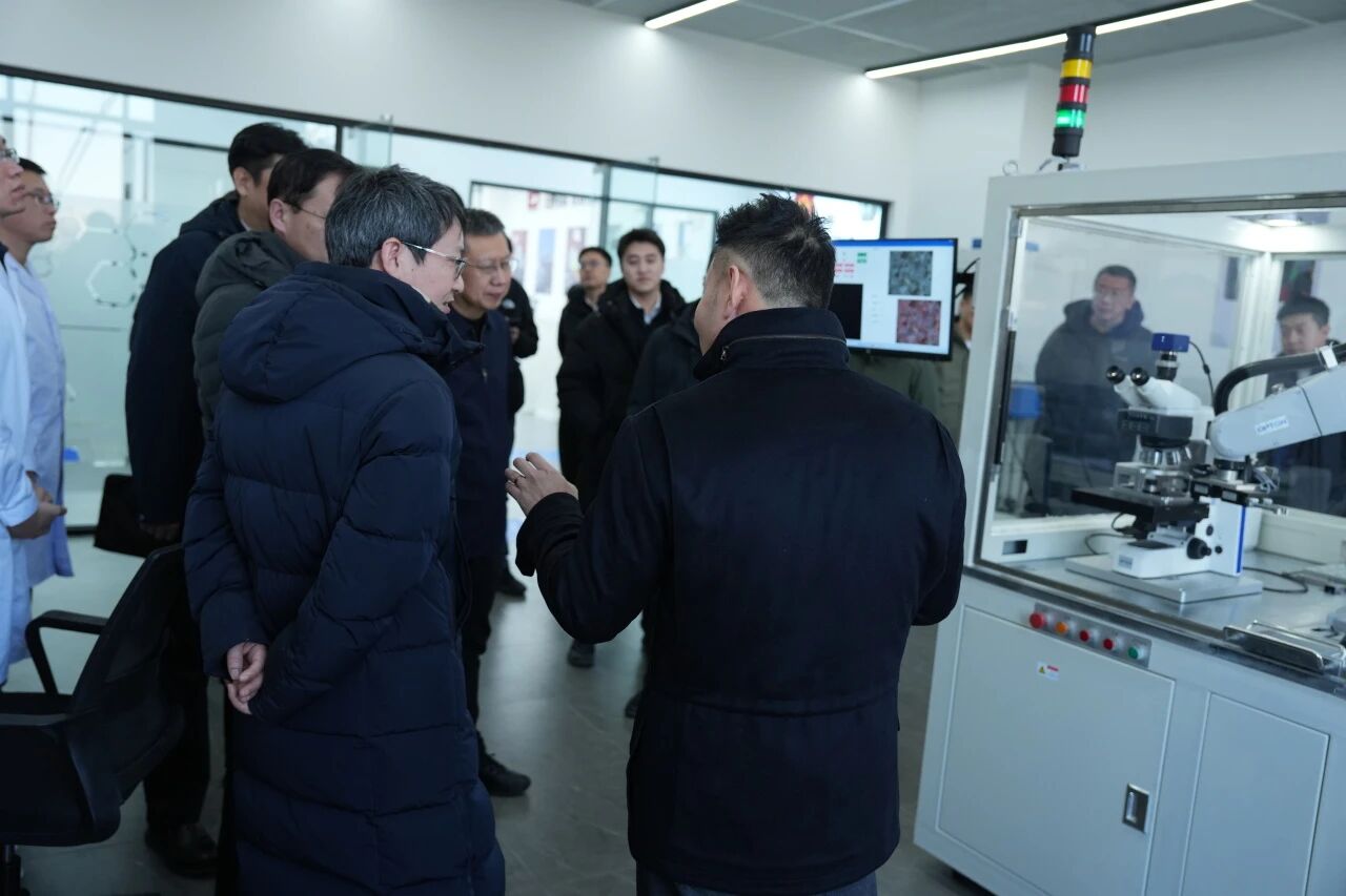 在锂电池材料显微智能分析系统前,调研组认真聆听工程师讲解,了解到该系统可自动捕获锂电池材料中的微米级杂质颗粒,检出率处于行业领先水平,有效助力锂电池行业提升产品安全性与稳定性,为新能源产业高质量发展提供坚实保障。