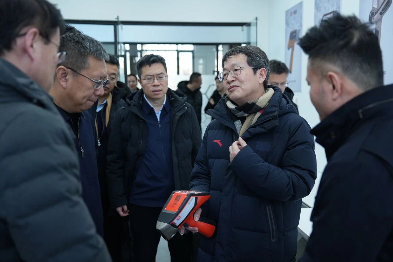 ZUI后,调研组一行走进朗铎实验室,重点考察了核心产品手持光谱仪。在工程师的演示讲解下,领导们上手体验了这款单手可握的便携设备。当得知该设备能实现检测结果即时输出,广泛适配地矿勘探、电力巡检、废旧金属回收、锂电池回收等多样场景及现场检测需求时,调研组对产品给予了高度认可。